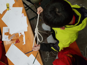 Ob allein, mit gegenseitiger Unterstützung oder mit unserer Hilfe, probierten die Mini-Jet´ler an einer Leine verschiedene Konten zu binden. Angefangen vom Achterknoten, über den Palstek und Webleinstek, bis hin zum Schotstek.